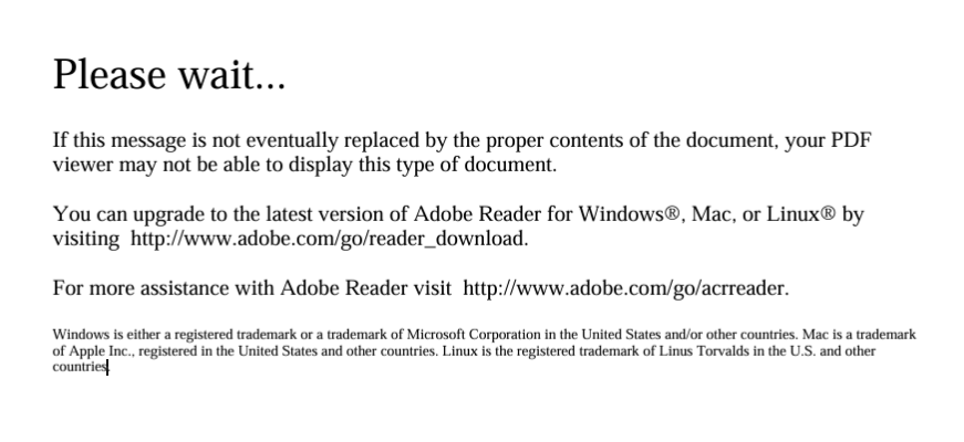 If the problem persists, it is possible that you do not have a .pdf reader installed on your computer or device. If you are using a personal computer or device, we recommend that you download and install the latest version of Adobe Reader for Windows®, Mac, or Linux® by visiting http://www.adobe.com/go/reader_download.