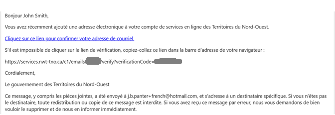 Cette étape permettra de confirmer l’adresse courriel et vous redirigera vers le Portail des services en ligne des TNO.